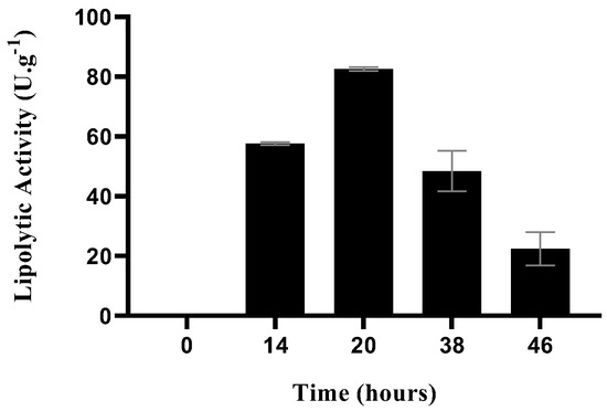 In relation to the supplementation with Tween 80, it was verified that after 14 h of fermentation, the lipolytic activity was 57.6 U·g−1. The same value was previously obtained only with soybean oil supplementation at 28 h of fermentation, which prolongs the fermentation process and impacts viability. The maximum lipolytic activity after 20 h of fermentation was 82.52 U·g−1, a 1.46-fold increase over lipase production using soybean oil alone and an 8-h reduction in the time process.