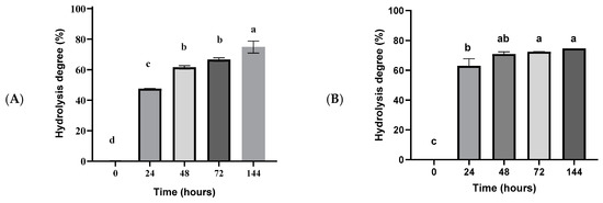 The degree of hydrolysis (DH) was calculated according to Equation (2):