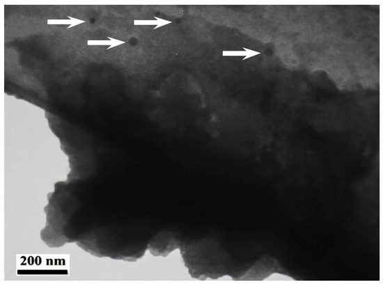Figure 3. TEM image of SPION@CS-IL catalyst. The arrows show the SPION.