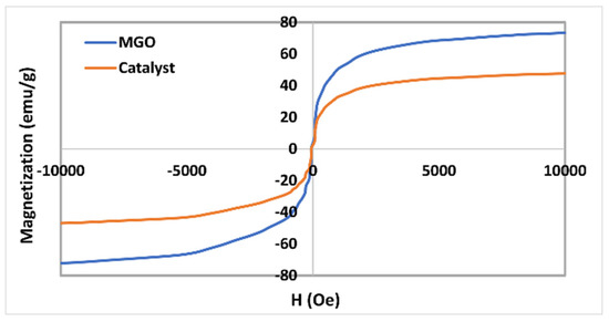 The vibrating sample magnetometer (VSM) method was used to evaluate the magnetic performance of the SPION@CS-IL catalyst. The superparamagnetic behavior of the catalyst may be seen in the VSM curve, which is shown in Figure 5. These results show the saturation magnetization values for SPION (blue) and SPION@CS-IL (red), which have been 75 and 40 emu/g, respectively. These findings demonstrated that functionalizing the catalyst with CS-IL significantly reduced the magnetization of SPION. The SPION@CS-IL catalyst’s magnetism is high enough to allow it to be removed from the reaction mixture using an outside magnet, though.