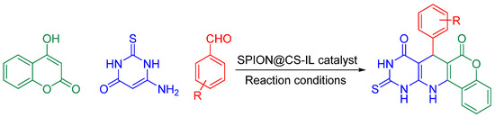 4-hydroxycoumarin (1 mmol), benzaldehyde (1 mmol), and 6-amino-2-thioxo-2,3-dihydropyrimidin-4(1H)-one (1 mmol) were added into a flask containing ethanol (3 mL). A total of 5 mg of SPION@CS-IL was added and the reaction mixture was stirred for 24 h at 70 °C. The reaction performance was followed up by thin layer chromatography, hexane/ethyl acetate, 95:5, volume ratio and after the reaction was completed, the catalyst was separated from the reaction mixture. The product was purified by recrystallization from ethanol and characterized by 1H NMR, 13C NMR, MS, FTIR, and melting point.