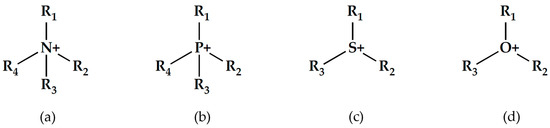 Ionic liquids: ammonium (a), phosphonium (b), sulfonium (c), and oxonium (d).