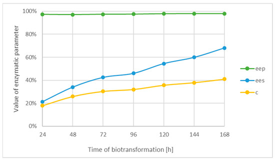 Effect of reaction time on the enzymatic parameters of the performed kinetic resolution of (R,S)-1-phenylethanol in the two-phase catalytic system consisting of [EMIM][BF4] and n-heptane as well as lipase from Burkholderia cepacia including values of both enantiomeric excesses of substrate (ees) and product (eep) as well as conversion (c).