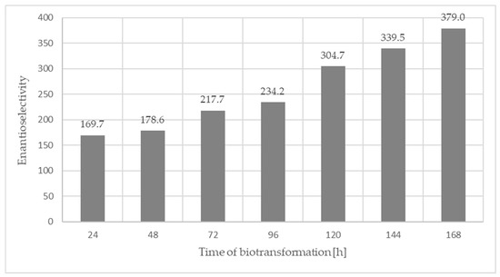 It is significant to test the duration of reaction time, since it is one of the most crucial aspects of the kinetic resolution of racemic compounds. Other investigations have shown that the enantioselectivity and enantiomeric excess of both products and substrates rapidly decline when the reaction medium is incubated for an excessively long time. During prolonged reaction, the reaction can no longer be regarded as enantioselective, as a result of the conversion having the potential to be higher than 50%. Commercially available lipases from Burkholderia cepacia (10 mg), vinyl acetate (28.25 µL; 0.3 mM) as an acetylating agent, (R,S)-1-phenylethanol (10 µL; 0.08 mM), [EMIM][BF4] (200 µL), and n-heptane (400 µL) were utilized as the reaction media in the experiment. The biotransformations were carried out for 168 h at 37 °C. According to Figure 4 and Figure 5, the reaction duration increased along with the conversion, enantiomeric excess of the substrate, and enantiomeric ratio. Over the same time span, the value of enantiomeric excess of products was constant. The value of conversion was the highest after 168 h of reaction, and it varied depending on the type of catalytic system (Table 2).