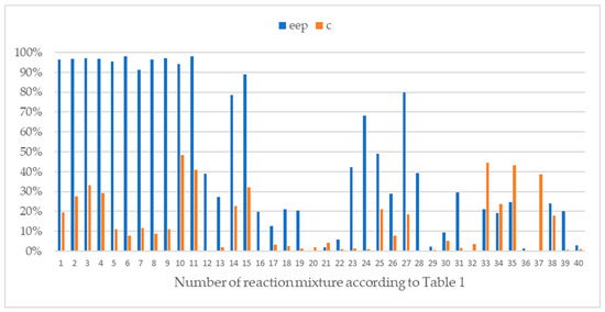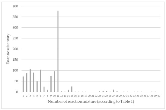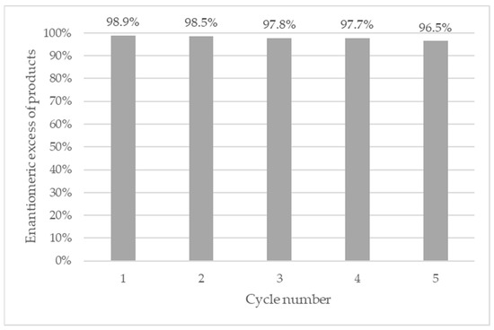 After the catalytic process, the remaining ionic liquid containing enantiomers of 1-phenylethanol and its derivatives was transferred to a separate tube. The same remaining lipase suspended in n-heptane was then added to a new batch of ionic liquid containing racemic 1-phenylethanol as the reaction substrate. The correct acetylating agent was used to initiate the enantioselective reaction (vinyl acetate). In the presented experiment, five reaction cycles were performed, reaching 840 h of catalytic and operational activity of the enzymes used. Enantiomeric excesses for all evaluated reaction mixtures after the fifth reaction cycle exceeded 95% of the starting value (Figure 8).