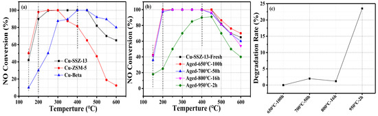 Cupric acetate (Cu(CH3COO)2·H2O) and H-SSZ-13 (Weihai Baidexin New Materials Co., Ltd., Weihai, China), H-ZSM-5 (Tianjin Nanfang Chemical Catalyst Co., Ltd., Tianjin, China) and H-Beta (Tianjin Baotou Steel Rare Earth Research, Tianjin, China) commercial supports with the Si/Al ratio of 14 were used for the experiment. The purity of cupric acetate produced by Tianjin Fengchuan Chemical Reagent Technology Co., Ltd. (Fengchuan, Tianjin, China) was 99%, and the specific surface areas of H-SSZ-13, H-ZSM-5 and H-Beta zeolites were 805.83, 474.04 and 759.91 m2·g−1, respectively. A certain amount of the hydrogen-type zeolite was slowly added into a 0.01 mol L−1 copper acetate solution according to the ratio of solid to liquid of 1:50 (g:mL) during stirring, and then ion exchanged in a water bath at 90 °C for 6 h, filtered, washed until the solution reached neutral, dried overnight at 90 °C and calcined at 550 °C for 8 h to obtain the copper-based catalysts with different zeolite supports. The fresh catalyst was thermally aged in 10% H2O in air at 650 °C for 100 h, 700 °C for 50 h, 800 °C for 16 h and 950 °C for 2 h, respectively, and labeled as aged-650 °C-100 h, aged-700 °C-50 h, aged-800 °C-16 h and aged-950 °C-2 h. The durability of the catalyst was expressed using the deterioration rate, which is the average value for the decrease in NO conversion for the aged samples at four temperature test points (200, 250, 450 and 500 °C).