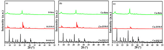 The XRD patterns of Cu-SSZ-13, Cu-ZSM-5 and Cu-Beta catalysts before and after copper ion exchange are presented in Figure 2. The chemical composition of the copper-based zeolites is listed in Table 1. As shown in Table 1, the Cu/Al ratios of the Cu-SSZ-13, Cu-ZSM-5 and Cu-Beta catalysts are 0.40, 0.38 and 0.40, and their corresponding copper ion exchange degrees are 79%, 75% and 80%, respectively. This indicates that the copper ion exchange degree of Cu-SSZ-13, Cu-ZSM-5 and Cu-Beta catalysts prepared by the high-temperature one-time ion exchange method is basically the same, and the Cu loading amounts are 2.4%, 2.3% and 2.5%, respectively. It can be seen from Figure 2a,b that the powder XRD patterns of these catalysts with different zeolite support structures are in excellent agreement with those of zeolite supports (i.e., H-SSZ-13, H-ZSM-5, H-Beta) and no diffraction peak of crystalline phase CuO is detected in all samples (2θ = 35.6°and 38.7°), except for minor differences in the relative X-ray peak intensity. The results show that they maintain structural integrity during the copper ion exchange. The Cu species can stably exist in the pore structure system of zeolite supports, and the crystal size of Cu-SSZ-13, Cu-ZSM-5 and Cu-Beta catalysts decreased gradually. The XRD patterns of the copper-based zeolites after the NH3-SCR reaction are presented in Figure 2c. Compared with fresh samples (Figure 2b), after the NH3-SCR reaction, the CHA and BEA structures in Cu-SSZ-13 and Cu-Beta catalysts still exist stably and the peak intensity is obviously enhanced, while the peak intensity of Cu-ZSM-5 is evidently reduced, and its crystal form has a tendency to develop into amorphous state, which may be caused by the collapse of the MFI structure of Cu-ZSM-5, and thus affect its high-temperature SCR performance.
