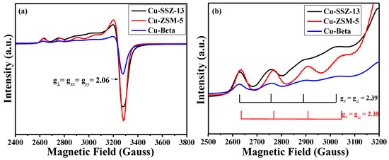 EPR is an effective method of characterization for identifying copper species in the copper-based zeolites. Cu2+ ions with one unpaired electron have a strong EPR response, while it should be noted that the Cu species such as Cu+, [Cu(OH)+] and CuOX clusters are all EPR-silent [13]. Consequently, the EPR signal of the Cu based zeolites can be attributed to the isolated Cu2+. The isolated Cu2+ is usually considered as the active site of a NH3-SCR reaction, and its content often determines the activity of the catalysts [18]. To compare the difference in the amount of isolated Cu2+ ions in Cu-SSZ-13, Cu-ZSM-5 and Cu-Beta catalysts, all samples were characterized by EPR. Figure 5a presents the EPR spectra for the Cu based zeolites recorded at 110 K. As shown in Figure 5a, Cu-SSZ-13, Cu-ZSM-5and Cu-Beta catalysts all have signal peaks of isolated Cu2+ ions at g⊥ = 2.06 and gǁ = 2.39 (or gǁ = 2.38), while the negative peaks at high field (g⊥ = 2.06) reflect the axial symmetry of the divalent copper ions [19]. The relative intensity of isolated Cu2+ions is obtained by the double integration of the EPR spectra of all samples, and the results are shown in Table 2. The order of the amount of Cu2+ ions in the Cu based zeolites is Cu-ZSM-5 ≈ Cu-SSZ-13 > Cu-Beta. It can be seen that the amount of isolated Cu2+ in Cu-SSZ-13 and Cu-ZSM-5 catalysts is basically the same, but they are obviously higher than Cu-Beta. The lack of enough isolated Cu2+ may also be an important reason why the Cu-Beta catalyst exhibits poor NH3-SCR performance in the low temperature range (150~250 °C). Figure 5b displays the hyperfine structures of copper ions for all samples at low field. The EPR characteristic signal peaks for the Cu based zeolites at gǁ = 2.39 (or gǁ = 2.38) should be attributed to Cu2+ located in the cationic sites around 6-rings, which is consistent with the reports in the literature [20].