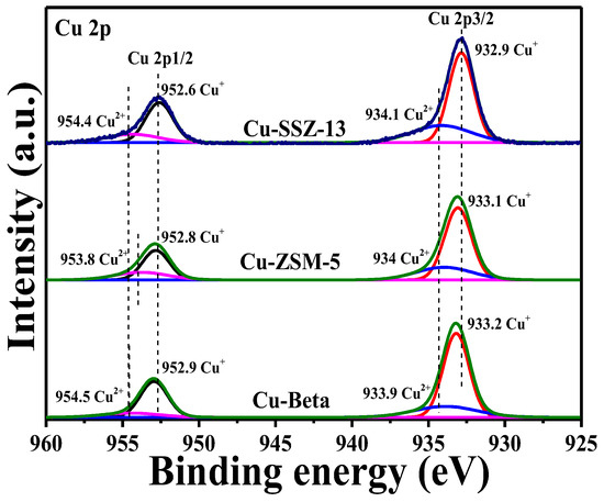 To further understand the copper species status on the surface of the copper-based zeolites, the catalysts’ surface were analyzed by X-ray photoelectron spectroscopy (XPS). The XPS spectra reveal that different Cu species existed on the surface of the copper-based zeolites associated with Cu contents. The XPS spectra for Cu 2p are presented in Figure 6. In Figure 6, the XPS spectra of Cu 2p in Cu-SSZ-13, Cu-ZSM-5 and Cu-Beta catalysts have two obvious peaks concentrated at ~952.8 eV and ~933.2 eV, which belong to Cu 2p1/2 and Cu 2p3/2, respectively. Through Gaussian fitting, the XPS spectra of Cu 2p of all samples can be fitted with four peaks. The peaks at 953.8~954.4 and 933.9~934.1 eV are attributed to Cu2+, the peaks at 952.6~952.9 and 932.9~933.2 eV are assigned to Cu+ [21,22]. Table 3 reveals the relative content of Cu+ and Cu2+ ions on the catalysts’ surface. The ratio of Cu2+/(Cu+ + Cu2+) was calculated according to the deconvoluted peak areas and used to measure the concentration of the Cu2+ species on the surface of the catalyst [23]. According to the area ratio of the Cu peaks, the surface Cu2+ concentrations of Cu-SSZ-13, Cu-ZSM-5 and Cu-Beta catalysts were 30%, 29% and 23%, respectively. The indicates that the concentration of Cu2+ ions on the surface of Cu-SSZ-13 and Cu-ZSM-5 is significantly higher than Cu-Beta, which may also be an important reason for the better low-temperature SCR activity of Cu-SSZ-13 and Cu-ZSM-5 catalysts. In addition, the ratio of Cu+/(Cu+ + Cu2+) on the surface of Cu-SSZ-13, Cu-ZSM-5 and Cu-Beta catalysts can all reach more than 70%, so the copper-based zeolites’ surface is mainly Cu+ ions. Luo et al. [24,25] believed that more Cu+ ions may increase the amount of oxygen vacancies on the catalysts’ surface, which is conducive to the adsorption, activation and migration of oxygen in the gas phase.