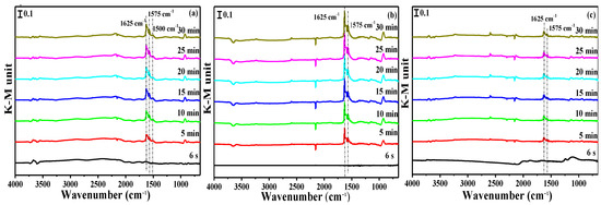 To more completely understand the differences in the catalytic properties of Cu-SSZ-13, Cu-ZSM-5 and Cu-Beta catalysts for NH3-SCR, the formation of reaction intermediates over these catalysts during exposure to a mixture of 500 ppm NO and 10% O2 (N2 as balance gas) at 150 °C was studied by in situ DRIFT spectra. As shown in Figure 11a–c, when the Cu-SSZ-13 catalyst is exposed to the mixed gas of NO and O2 for up to 30 min, there is a continuous increase in the intensity of the absorption peak in the 1250–1750 cm−1 region, which is resolved into three peaks at 1625, 1575 and 1500 cm−1. These peaks can be attributed to nitrate ions (NO3−) gradually generated on the Cu sites with increasing exposure time to 30 min, while the peak round 1575 cm−1 can be assigned to bidentate nitrate [53], and the amount of nitrate ion will increase with the increase of exposure time. A similar trend can be observed in the in situ DRIFT spectra of Cu-ZSM-5 and Cu-Beta catalysts compared to the Cu-SSZ-13, except for the latter two only appear two peaks around 1625 and 1575 cm−1. According to DRIFTS-NO adsorption results, NO is mainly adsorbed on isolated Cu2+ ions and forms the Cu2+-NO active species. Hence, it can be considered that NO3− is also mainly formed on the active Cu2+ ion sites. The intensity sequence of NO3− absorption peaks in the 1250–1750 cm−1 region is Cu-ZSM-5 > Cu-SSZ-13 > Cu-Beta, indicating that more NO3− will be formed on the Cu-ZSM-5’ surface, which may be caused by more isolated Cu2+ contained in the Cu-ZSM-5 catalyst. Therefore, NO3− is known as one of the key reaction intermediates for the NH3-SCR reaction over metal-exchanged zeolite catalysts.