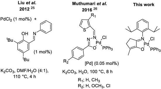 Schiff base-derived ligands have been shown to provide alternatives to classic phosphine-based catalysts with similar easy tuning of their steric and electronic properties [8,29,30,31,32]. One catalyst design of note was developed by Liu et al. using salicylaldimine ligands with PdCl2 to form catalytic species in situ, which were capable of coupling a wide range of aryl bromides between room temperature and 60 °C under 6 h (Figure 1) [33]. The use of pre-formed neutral Pd [N,O] catalysts in green solvents has also been observed in recent work by Muthumari et al. which was capable of coupling alkyl bromides with a range of boronic acids in yields of approximately 90% after 3 h at 100 °C in water. The catalyst was also capable of coupling 4–chloroacetophenone to phenyl boronic acid, but this required 8 h at 100 °C [34].