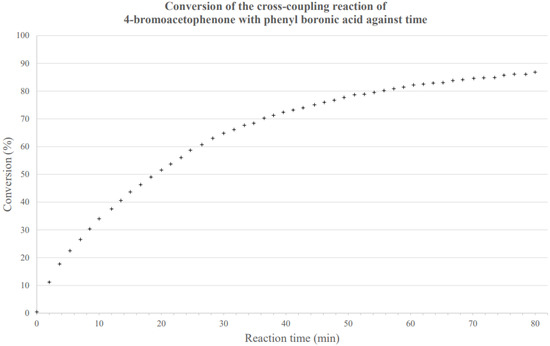 Reaction profile for the NMR conversion of the cross-coupling reaction of 4–bromoacetophenone with phenyl boronic acid against time.