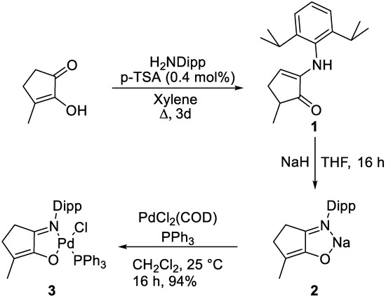 Synthesis of the proligand was carried out as previously detailed through the condensation of maple lactone with 2,6–diisopropylaniline using catalytic amounts of p-toluenesulfonic acid (Scheme 1) with single substitution seen to occur selectively at the ketone position [38]. The reaction with NaH gave the corresponding sodium imino–enolate (2) that reacted smoothly with [PdCl2(COD)] and PPh3 to give the desired Pd complex 3 in 94% yield.