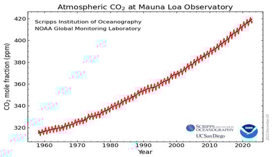 Carbon dioxide (CO2) is the second most abundant greenhouse gas in the Earth’s atmosphere due to the vast and excessive emissions from human activities related to the burning of fossil fuels [1] with concomitant environmental problems [2]. It is estimated that around 80% of the world’s energy demand is supplied by fossil fuels. These anthropogenic emissions are considered to be the major contributors to climate change which may cause extreme events (high or low temperature, dryness, etc.) that are beyond human control. Some technologies have been introduced to reduce the CO2 emissions [3], although they have been increased since the 1960s to a current level of more than 400 ppm in 2020 [4], as illustrated in Figure 1. Moreover, predictions indicate that CO2 emissions will continue to increase until at least 2040 [5], with devastating consequences for the environment.