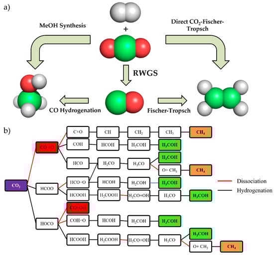 (a) Simplified scheme about different CO2 hydrogenation pathways. (b) Reaction map of CO2 hydrogenation including reaction intermediates. Red, orange, and green panels show the final products.