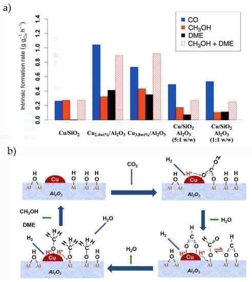 (a) Intrinsic formation rates for CO, MeOH, and DME after the deposition of Cu NPs on different oxide supports. Extracted with permission from Ref. [66]. Copyright Wiley-VCH. (b) Proposed reaction mechanism for CO2 hydrogenation over Cu/Al2O3, extracted with permission from Ref. [68]. Copyright ACS.