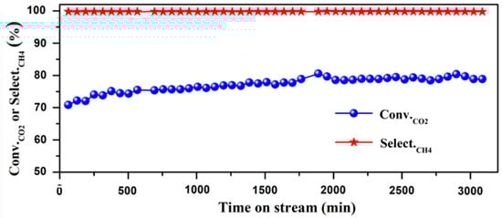 The combination of Cu and Ni particles on SiO2 was investigated for CO2 methanation, concluding that higher Ni content increases CO2 conversion and CH4 selectivity, and Cu-promoted samples favor the CO selectivity [101]. Therefore, it seems clear that Ni NPs favor methanation, whereas Cu NPs enhance hydrogenation into MeOH. The catalytic activity of Ni supported on SiO2 for CH4 production was reported by several authors [102,103,104], showing the high conversion of carbon dioxide and 100% selectivity to CH4 (Figure 4). The work by Wu and collaborators revealed the importance of Ni coverage and size, since at low Ni loading (0.5 wt%), the system showed comparatively higher catalytic activity for CO2 hydrogenation with large CO selectivity, whereas increasing the content to 10 wt%—9 nm particles—a selectivity switch was observed, favoring CH4 production [105]. The promotion of Ni/SiO2 with other metal particles such as Fe, Co, and Zn was studied by Dias and Perez-Lopez, showing that Fe and Co enhanced CO2 conversion and selectivity towards CH4, while Zn did not favor CO2 conversion and promoted the production of CO [106]. Huang et al. recently investigated the combination of Ni and Pt particles on SiO2, reporting that CH4 was the main product only when the Ni/Pt molar ratio was higher than 9, owing to the fact that Pt NPs can directly dissociate CO2 to CO [107]. The addition of Sn to Ni/SiO2 slightly improved the activity and the catalytic stability at 650 °C, reducing the carbon formation, although a very small amount of Sn had a negative effect on the activity and stability of the Ni/SiO2 catalyst [108]. Finally, Kattel and coworkers reported that Pt NPs are able to enhance the overall CO2 conversion due to the CO2 binding energy on SiO2 with oxygen vacancies [109].