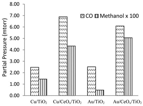 TPR at 573K of CO2 hydrogenation over Cu/TiO2 and Cu/CeOx/TiO2, Au/TiO2, and Au/CeOx/TiO2 to produce CO and MeOH reproduced with permission from Ref. [168]. Copyright ACS.