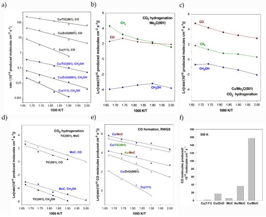 Arrhenius plots for CO, MeOH, and CH4 production on different bare and metal-supported carbides catalysts at different temperatures. Panel (a) shows the performance of Cu/TiC in comparison to Cu surfaces and the model of commercial catalysts for CO2 hydrogenation. Panel (b,c) illustrate the products for CO2 hydrogenation using bare Mo2C and Cu/Mo2C respectively. Panel (d) compares the performance of TiC and MoC for CO2 hydrogenation evaluating the formation of CO and MeOH. Panels (e,f) compares the CO production among different catalysts. All the reported values correspond to the optimized NP sizes and loadings. Figures adapted with permission from Refs [203,204,207,208]. Copyright ACS, Elsevier B. V., and Royal Chemistry Society.