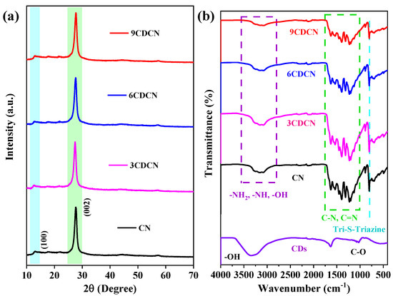 (a) The XRD pattern of CN, 3CDCN, 6CDCN, and 9CDCN, and (b) FT−IR spectrum of CDs, CN, 3CDCN, 6CDCN, and 9CDCN.