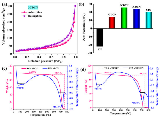 (a) BET isotherm of the 3CDCN nanocomposite, (b) Zeta potential of CN, 3CDCN, 6CDCN and 9CDCN, CDs and TGA, and the DTA graph of (c) CN and (d) 3CDCN.