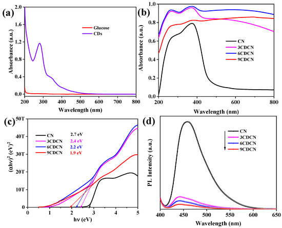 Changes in the UV-vis absorption spectra could be used to detect surface functionality variations. As a result, Figure 5a depicts the UV-vis spectra of glucose and as-synthesized CDs, emphasizing the distinct influence of reaction time. Finally, 30 min of microwave irradiation resulted in the formation of a new absorbance peak at 280 nm, with non-bonding orbitals such as C=O bonds attributed to the n → π* transitions. The optical properties were analyzed using UV-vis DRS spectra (Figure 5c), and the relevant band gap was estimated using Tauc’s plot (Figure 5c). At about 470 nm, pure g-C3N4 exhibited a fundamental absorption edge. As the number of CDs that were being loaded increased, the absorption edge in red gradually migrated from the beginning at 470 nm. This finding implies that when CN is hybridized with CDCN, it can harvest more visible light, which is crucial for improving photocatalytic performance because better visible light utilization can result in producing more effective photo-generated electron-hole pairs. The band gap of pure CN was calculated to be approximately 2.77 eV, which is very similar to previous g-C3N4 results [59]. The band gaps of 3CDCN, 6CDCN, and 9CDCN were 2.4, 2.2, and 1.9 eV, respectively, indicating that they narrowed progressively from 2.4 to 1.9 eV when increasing the loading of CDs.