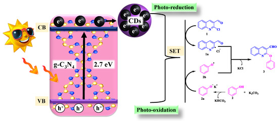 Relying on all these findings, we propose a plausible mechanism, as illustrated in Figure 6. Under light irradiation, the 3CDCN nanocomposite absorbs light, resulting in photoinduced electron-hole pairs in the conduction and valence bands. The produced charge carriers are then counterbalanced by recombination, when a few of them move to the composite’s surface [62]. Thus, the photocatalyst becomes excited. Then, the excited electrons in the conduction band can easily flow through CDs. Thus, a Schottky-like heterojunction is formed [63]. This excited photocatalyst thus induces the homolytic C-Cl bond cleavage of 1, producing 1a. This radical generation is induced by the single-electron transfer (SET) of the photoexcited catalyst, where the photoreduction takes place [64]. Accordingly, the intermediate, 2a, is found to be produced by the proton abstraction of 2 by the base. Then, photo-oxidation takes place, thus generating the phenoxy radical, 2b [65]. Finally, the radical-generated moieties, 1b and 2b, couple together to produce the desired O-arylated product, 3, by the elimination of KCl.