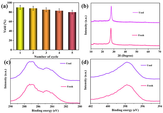 Figure 7 depicts the 3CDCN photocatalyst recovery and reuse activities. In the current study, 3CDCN was collected by centrifugation, washed with acetone, and reused in the subsequent round of photocatalytic reactions. According to Figure 7a, the photocatalytic performance slightly declined after four trials, to 80%. This small decline in 3CDCN photocatalytic activity could be due to the material losses that might occur during the recovery process (washing and drying), which would result in a reduced dose in the following cycle, hence reducing the specific surface catalytic activity and lowering the performance. In order to determine the reason for this decrease in the photocatalytic performance of 3CDCN during its recycling, in terms of the photocatalytic O-arylation of 2-chloroquinoline-3-carbaldehydes, the physicochemical properties of the fresh and recycled 3CDCN nanocomposite were compared via XRD and XPS analyses. After the process was completed, the 3CDCN photocatalyst’s XRD patterns and XPS (C1s and N1s) findings remained consistent, demonstrating that no significant structural or chemical changes occurred in the 3CDCN photocatalyst (Figure 7b,d). Thus, it can be said that the CDs/g-C3N4 nanocomposite photocatalyst was stable and had the potential to be used in industrial applications.