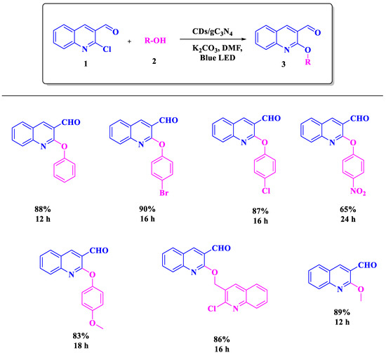 The compound (1) was prepared and compared with the method in the literature [66]. Yield 79%, m.p. 148 °C. For the O-arylation of 2-chloroquinoline-3-carbaldehydes, the reaction vial was charged with 2-chloroquinoline-3-carbaldehyde (0.5 mmol, 96 mg, 1 equiv.), substituted phenol (0.5 mmol, 1 equiv.), K2CO3 (2 mmol, 138 mg, 2 equiv.), DMF (2 mL), and photocatalyst (9.6 mg, 10 wt %). The mixture was irradiated under blue LED (12W, 495 nm) for 12–24 h until the product was formed. The reaction was monitored by TLC. After completion of the reaction, the reaction mixture was poured into crushed ice, filtered, dried, and column-purified, using ethyl acetate/petroleum ether (1:9) as an eluent.