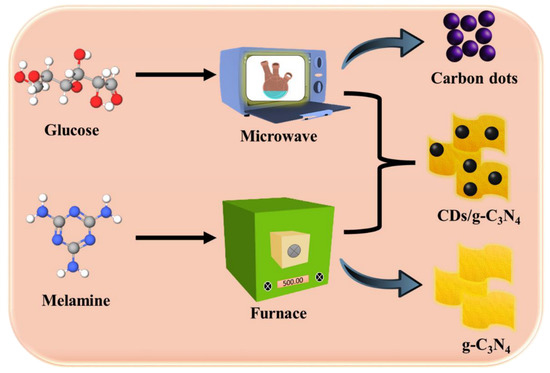 The schematic synthesis procedure of the CDs/g-C3N4 nanocomposite.