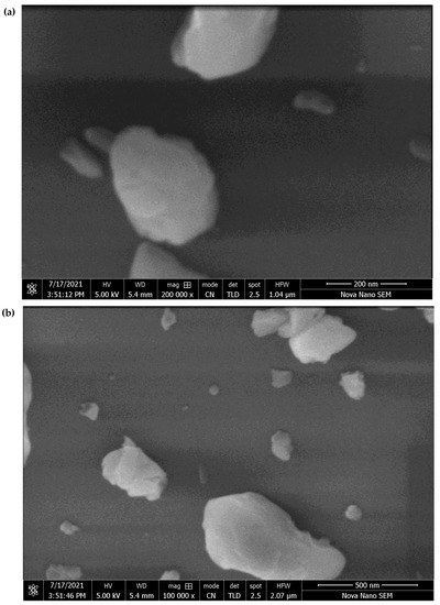 SEM/EDX for feldspar nanoparticles can be seen in Figure 3. The obtained micrographs of samples were of high crystallinity and non-uniform size. The K-feldspar showed a mesoporous lamellar structure. Due to its multiplicity and complex interfaces, a crossed-lamellar structure provides a high surface area [29,30].
