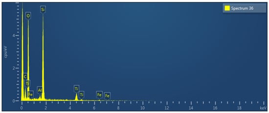 The SEM/EDX images of Li-TiO2 supported on feldspar are displayed in Figure 3. SEM image shows the presence of embedded grains without sharp boundaries. The agglomeration of small grains to form large grains can be clearly observed in the images. This resulted in the appearance of small nano holes on the surface of the composite [31]. The dark spots represent the porosity in the sample. Porous materials increase the specific surface area and thus increase the catalytic activity. The EDX spectrum for Li-TiO2 supported on feldspar was obtained in order to confirm the chemical composition of the sample. The spectrum depicts (Figure 4) the presence of all of the elements, i.e., O, Si, Ti, Fe and Al, with weight percentages of 57.75%, 18.77%, 5.68%, 1.22% and 0.75%, respectively. All of the elements in the sample were detected, except for lithium (Li), due to the inability of the EDX technique to detect small-Z elements [32].