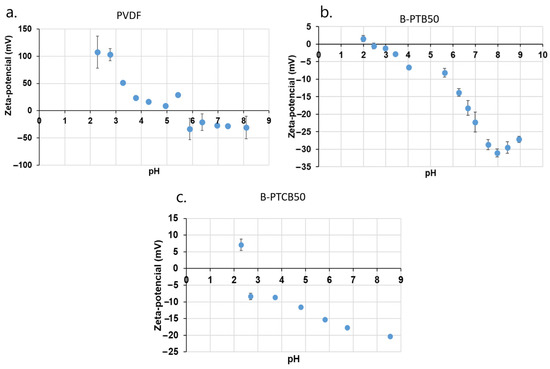 Zeta potentials of unused PVDF, blended PVDF-TiO2/BiVO4 (50–50%) composite (PTB50), and blended PVDF-TiO2/CNT/BiVO4 (48–2–50%) composite (PTCB50) membranes.