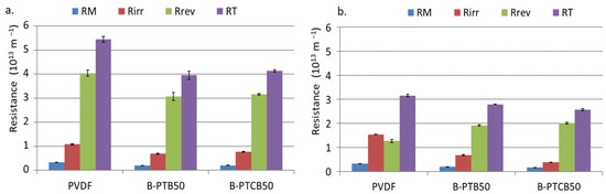 Filtration resistances of PVDF, B-PTB50, and B-PTCB50 membranes during real dairy wastewater filtration are shown in Figure 5. Higher resistances were observed for unfiltered wastewater (Figure 5a) than for pre-filtered wastewater (Figure 5b). These results indicate the need for pre-filtration during real dairy wastewater treatment by membranes. However, in both cases, the total and irreversible resistances of PVDF membranes were higher than those of the improved (B-PTB50 and B-PTCB50) membranes.
