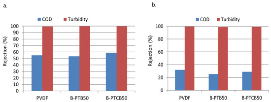 Rejection performance of pristine PVDF, PTB50, and PTCB50 membranes during real dairy wastewater filtration, using unfiltered (a) or pre-filtered (0.2 µm filter paper) wastewater (b).