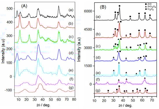 XRD patterns of (A) oven-dried and (B) calcined samples of different mole ratio (a) Zn4Cr1, (b) Zn3Cr1, (c) Zn2Cr1, (d) Zn1Cr1, (e) Zn1Cr2, (f) Zn1Cr3, and (g) Zn1Cr4.