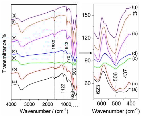 FTIR patterns of (a) Zn4Cr1, (b) Zn3Cr1, (c) Zn2Cr1, (d) Zn1Cr1, (e) Zn1Cr2, (f) Zn1Cr3, and (g) Zn1Cr4 samples.