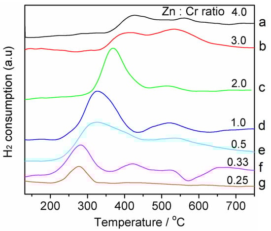 TPR patterns of different mole ratio of Zn/Cr (a) Zn4Cr1, (b) Zn3Cr1, (c) Zn2Cr1, (d) Zn1Cr1, (e) Zn1Cr2, (f) Zn1Cr3, and (g) Zn1Cr4.