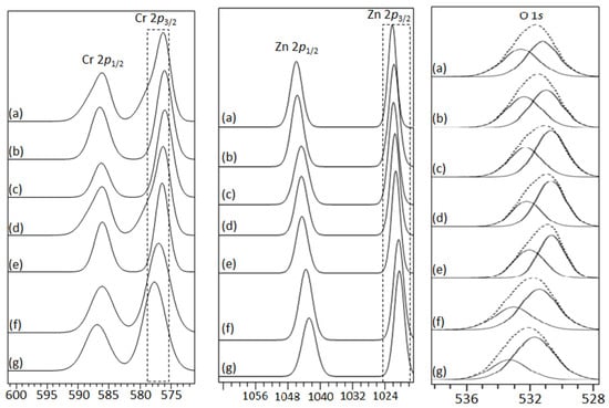 X-ray photoelectron spectra of (a) Zn4Cr1, (b) Zn3Cr1, (c) Zn2Cr1, (d) Zn1Cr1, (e) Zn1Cr2, (f) Zn1Cr3, and (g) Zn1Cr4 samples.