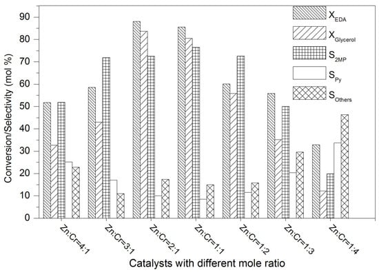 The dehydrocyclization of aqueous glycerol and EDA was carried out at 375 °C, over Zn-Cr-O samples prepared by varying Zn/Cr mole ratios, and the product distribution is reported in Figure 5. At a high ratio of Zn, the Zn4Cr1 catalyst showed about 51.8% conversion of EDA and 61% glycerol, while the Zn1Cr4 demonstrated EDA ~32.9% and glycerol at 12.2%. At lower Zn concentration, poor conversions of EDA and glycerol were noticed. The catalyst with Zn3Cr1 showed 45% glycerol and 65% EDA conversion, while the bulk individual oxides such as ZnO and Cr2O3 showed r2-MP ~0.94 × 10−3 and 0.061 mol s−1 (gcat)−1, respectively, which is inferior to the activity of mixed oxides of Zn-Cr catalysts [].