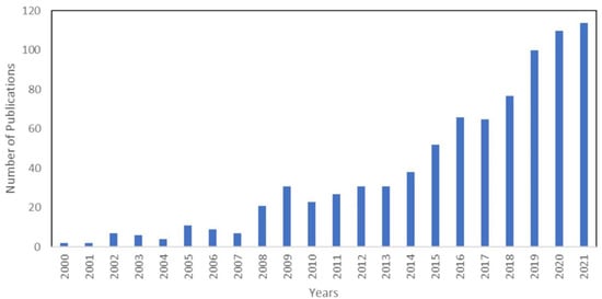 In the ozonation process, the addition of some catalysts can promote the decomposition of the oxidant (O3) to generate active free radicals, such as HO•. Compared with other O3-based treatment methods, catalytic ozonation can reduce operational costs since it does not need additional energy costs such as for UV or for pH adjustment due to its effectiveness in a wide range of pH values. Moreover, the catalytic ozonation systems have shown exemplary performance in water treatment, with several advantages compared to ozonation alone. Several pieces of evidence based on published articles show that the catalytic ozonation process achieved higher mineralization of various organic compounds than the sole ozonation system [12]. All of these reasons make catalytic ozonation an interesting water treatment process and one of the main AOPs processes that received significant attention from scientists. Figure 1 shows the gradual increase in scientific publication since 2000 based on approximately 600 published articles found in the Web of Science collection database.