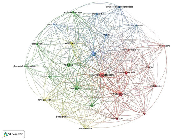 Co-occurrence of the keywords in articles related to catalytic ozonation visualized by VOSviewer software.
