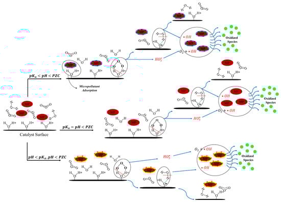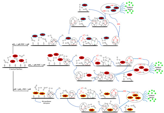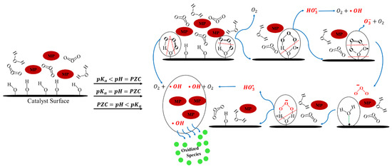 Other metal oxide catalysts need to be mentioned, such as magnetic Fe3O4 nanoparticles [104] and δ-MnO2 [105]. These metal oxides have shown good removal efficiencies but have not been reported in Table 5 as their pH values are not reported in the articles so their unclear process conditions do not allow to frame them in the proposed mechanism.