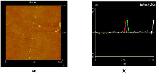 To confirm the formation of composites through sample characterization, TEM, XRD, Raman, FT-IR, XPS, and EDX analyses were performed. The surface morphology of the crystalline composites could be easily observed from TEM images as indicated in Figure 1. Figure 1a clearly exhibits the ultrathin film structure of the samples confirmed to be the characterization of 2D material as it was revealed. Moreover, the electron diffraction patterns of the selected area as shown in Figure 1b also confirmed the crystalline nature of the sample. To further determine the thickness of the PN, the AFM characterization technique was applied through an optical contrast analysis (Figure 2a). The results indicated that the clear edges of the PN were still sharpened, suggesting that oxidation was unlikely to have occurred during material preparation. Moreover, the height profile from Figure 2b showed that the thickness of the PN was approximately 3.0–5.0 nm. According to Liu et al. [2], the thickness of a single layer of PN is approximately 0.9 nm, suggesting that the number of sample layers could have been approximately 3–5. This is consistent with the findings of the TEM.