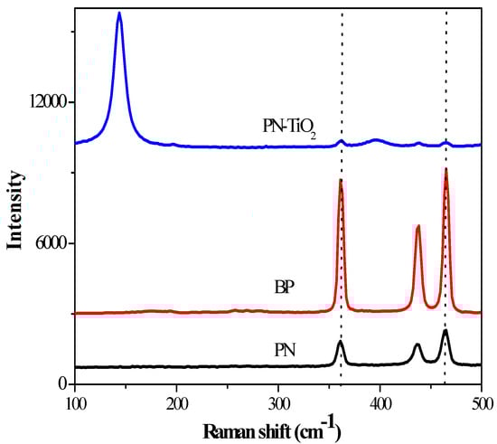 To identify the substructure and electronic features of PN and PN-TiO2 composite, Raman spectra were implemented as shown in Figure 3. The results indicated that three Raman characteristic peaks of black phosphorous (BP) and PN were displayed at approximately 361 cm−1, 436 cm−1 and 463 cm−1. These peak wavelengths corresponded to phosphorous. It was confirmed that the second sample prepared was indeed a phosphorous homologous substance. An apparent shift was observed for the composite samples at 361 cm−1 and 463 cm−1, indicating a comparatively smaller thickness than that of BP. This was due to a positive relationship between the extent of the shift and the PN thickness as reported in the literature [1]. There were more and less obvious additional peaks at 144 cm−1 and 391 cm−1, respectively, in the Raman spectroscopy of PN-TiO2. The two characteristic peaks corresponded to the typical figure of Raman spectra for anatase, directly indicating that the TiO2 sample was P25 and the ratio of anatase to rutile was 80/20 [2]. Moreover, the formation of three signals identified the approximate locations of 361 cm−1, 436 cm−1 and 463 cm−1 in the curve of PN-TiO2 composites, suggesting that PN was successfully combined with TiO2 [3].