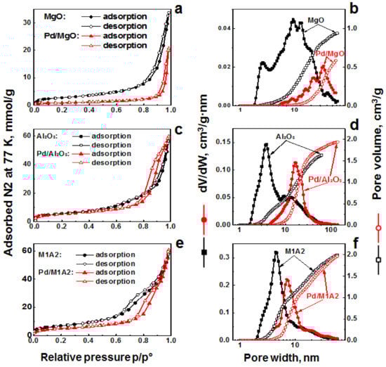 Nitrogen adsorption–desorption isotherms (a,c,e) and pore size distribution (b,d,f) on aerogel-prepared MgO (a,b), M1A2 (c,d), and Al2O3 (e,f) before and after supporting Pd. The differential pore size dV/dW distributions are given by closed symbols, the cumulative volume pore size distributions are given with open symbols. The Broekhoff–de Boer model was used for slit-like pores in MgO, Pd/MgO, M1A2, Pd/M1A2, and Al2O3 and for cylindrical pores in Pd/Al2O3; the regularization factor was 0.1.