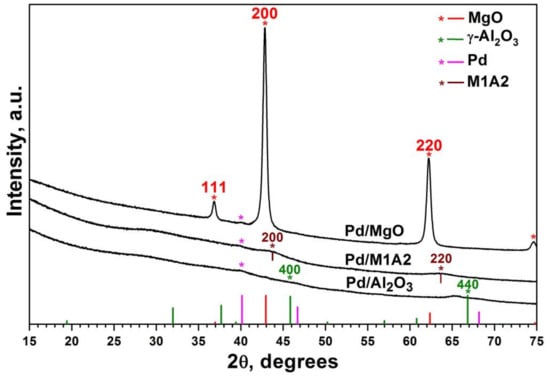 To determine the phase composition of the synthesized systems, we performed an XRD analysis of the Pd/MgO, Pd/Al2O3, and Pd/M1A2 catalysts. According to the XRD data, only the pure MgO system was well-crystallized (Figure 2, 111, 200, 220). Aerogel-prepared MgO samples calcined at 500 °C are known to consist of MgO nanoparticles with average dimensions of 4–5 nm []. In the mixed oxide, the peaks were shifted to larger angles in comparison with MgO. This meant that the lattice parameter was smaller than in pure MgO, due to the smaller radius of Al3+ cations compared to Mg2+. Furthermore, the mixed oxide contained cationic vacancies to compensate for the extra charge of the Al3+ cations. No peaks attributable to the MgAl2O4 spinel phase were observed in the XRD pattern of M1A2.