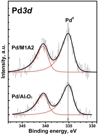 To determine the possible effect of the support composition on the electronic properties of the supported palladium, the Pd/Al2O3 and Pd/M1A2 catalysts were studied by XPS. Core-level photoelectron peaks corresponding to Pd3d5/2 (335.1 eV), O1s (531.3 eV), C1s (284.6 eV), and Al2p (74.5 eV) were observed in the survey spectra of both catalysts. In addition, a peak at 50.9 eV corresponding to Mg2p was observed for Pd/M1A2. The Pd3d core-level spectra of the studied samples are shown in Figure 4. The spectra are described well by the Pd3d5/2-Pd3d3/2 doublet with a 3:2 intensity ratio. The binding energy of the Pd3d5/2 peak was 335.1 eV for both samples. This value is in an excellent agreement with the literature data for palladium in the metal state (335.0–335.2 eV) [,]. Thus, it was demonstrated that palladium was in the Pd0 state on the surface of both catalysts, and the presence of basic sites associated with Mg did not have a significant effect on the electronic state of Pd. The ratios of the atomic concentrations of Pd/Al and Pd/(Al+Mg) in the near-surface catalyst layer were similar for both samples and equal to 0.0038 and 0.0035 for Pd/Al2O3 and Pd/M1A2, respectively. These values were close to the theoretical value of 0.005 corresponding to 1 wt.% Pd.
