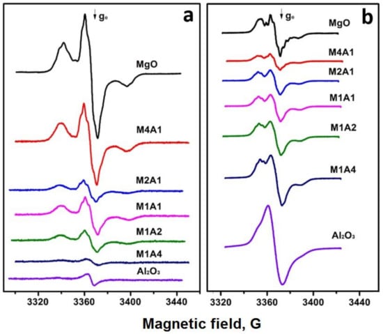 Both probe molecules had one nitrogen atom. Thus, the EPR spectra of the ion radicals formed after their adsorption on the active sites were characterized as three-component spectra with hyperfine splitting on the nitrogen atom (Figure 5). The spectra observed after the adsorption of 1,3,5-trinitrobenzene (TNB) on the aerogel supports (Figure 5a) were similar to the previously reported spectra of TNB radical anions on the Al2O3 surface []. They were characterized by a triplet EPR signal with frozen rotation with g = 2.005 and a hyperfine splitting constant AZZ of about 28 G, which did not depend much on the Mg:Al ratio. This result indicates that electron-donor sites donating a single electron to the TNB molecule, similar to those present on the Al2O3 surface, existed on the surface of all studied aerogel samples. Previously, such sites were shown to stabilize palladium deposited on the Al2O3 surface in a finely dispersed state with high CO oxidation activity []. The concentration of strong electron-donor sites revealed immediately after the probe adsorption generally grew with the increase in the Mg concentration in the sample (Table 2). This was quite natural because the increase in the Mg:Al ratio was expected to lead to an increase in the sample basicity. The highest concentration (2.4 × 1018 g−1) was observed on M4A1 and on pure MgO, which had a substantially lower surface area. The concentration of such sites on the Al2O3 aerogel was approximately four times lower.