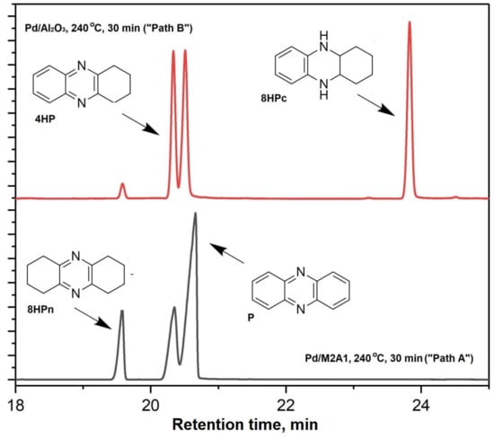 The analysis of the reaction mixture probes taken at intermediate dehydrogenation times (10, 20, and 30 min) revealed significant differences in the reaction routes of dehydrogenation between the catalysts containing MgO and the catalysts based on Al2O3. Typical chromatograms of the reaction mixture probes taken after 30 min of dehydrogenation over Pd/M1A2 and Pd/Al2O3 are shown in Figure 6. 1,2,3,4,4a,5,10,10a-octahydrophenazine (8HPc) was registered as an intermediate over Pd/M1A2, whereas the reaction mixture composition over Pd/Al2O3 was similar to that observed previously over Pd/Pural-550 prepared using a commercial Al2O3 support [].
